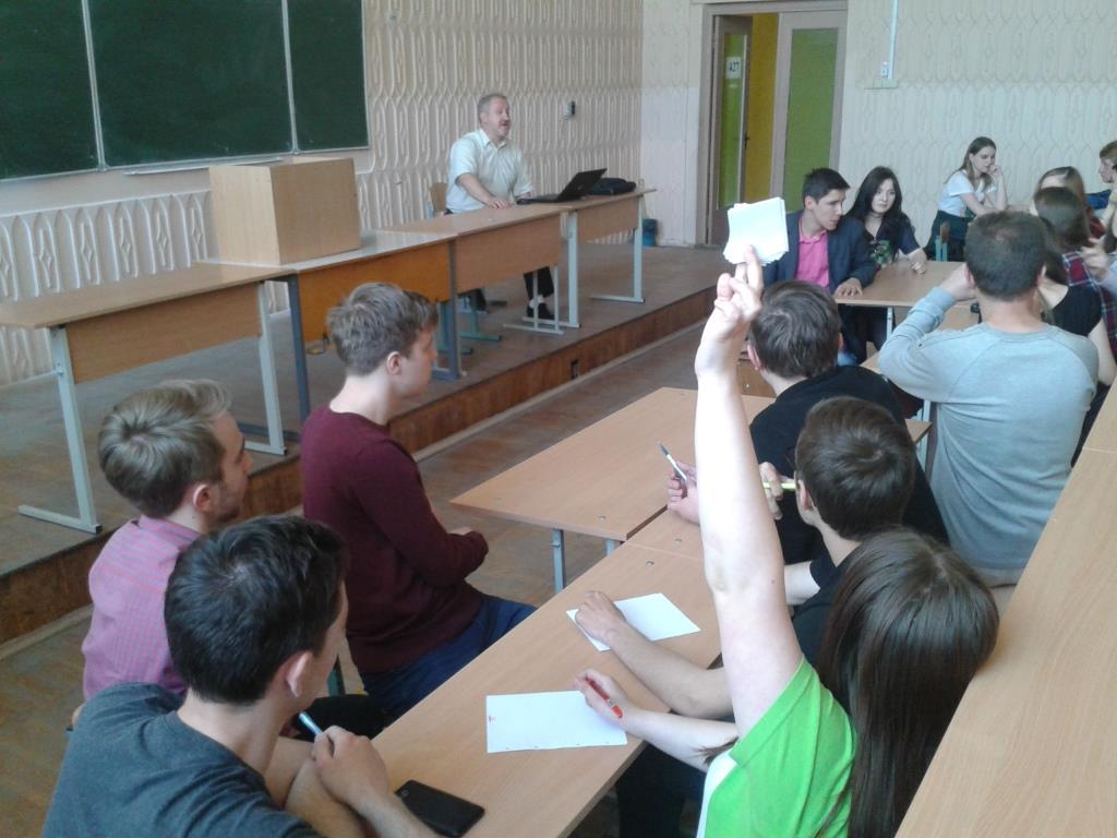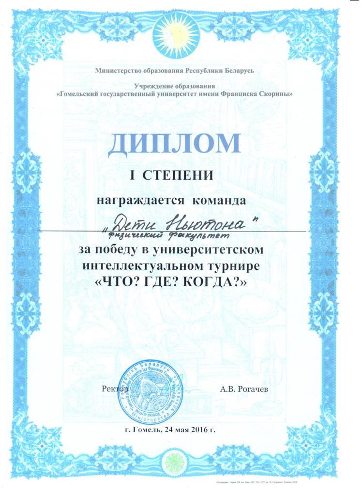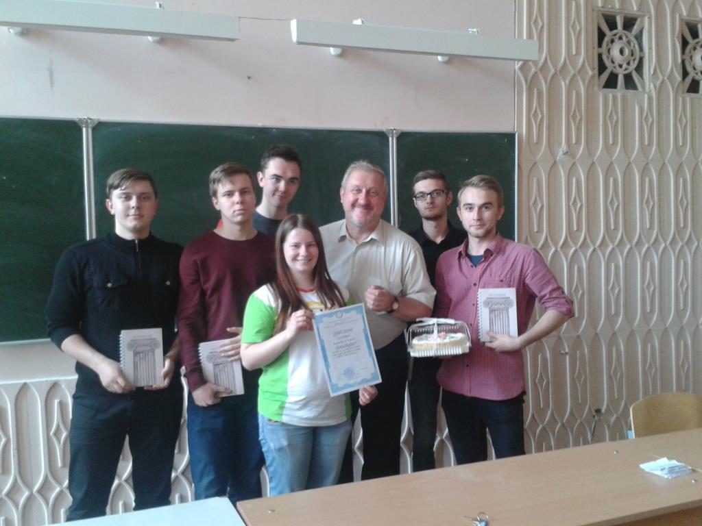 Поздравляем команду физического факультета «Дети Ньютона» занявшую первое место в университетском интеллектуальном турнире «Что? Где? Когда». Состав команды (гр.Ф-23пед: Мушинская Татьяна, Дзюба Владислав, Пустаханов Дмитрий, Слепенков Дмитрий, Песенко Владислав; Бондарь Константин (гр. Ф-24пр)). В турнире так же участвовали команды факультета иностранных языков и факультета психологии и педагогики. Вел игру двукратный чемпион Беларуси по спортивному «Что? Где? Когда?» и «Брэйн-ринг», руководтель клуба интеллектуальных игр «Белая Рысь» - Леонид Климович.