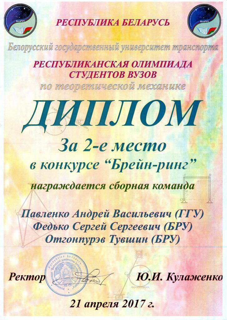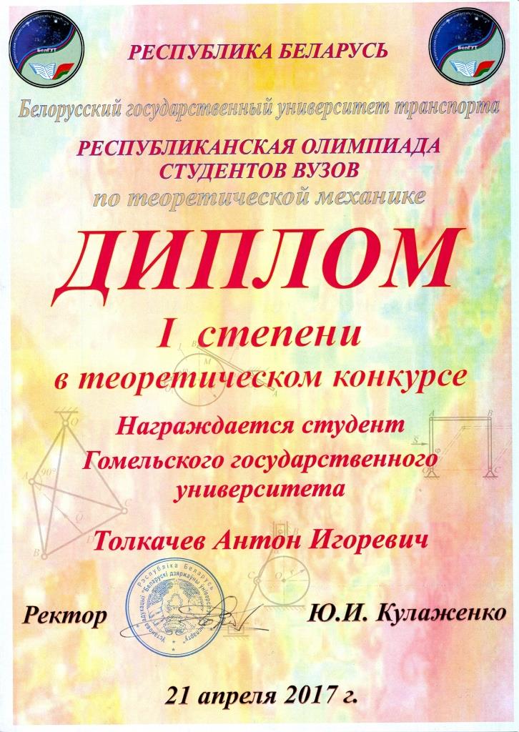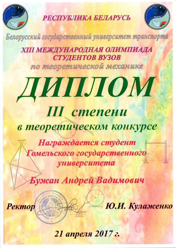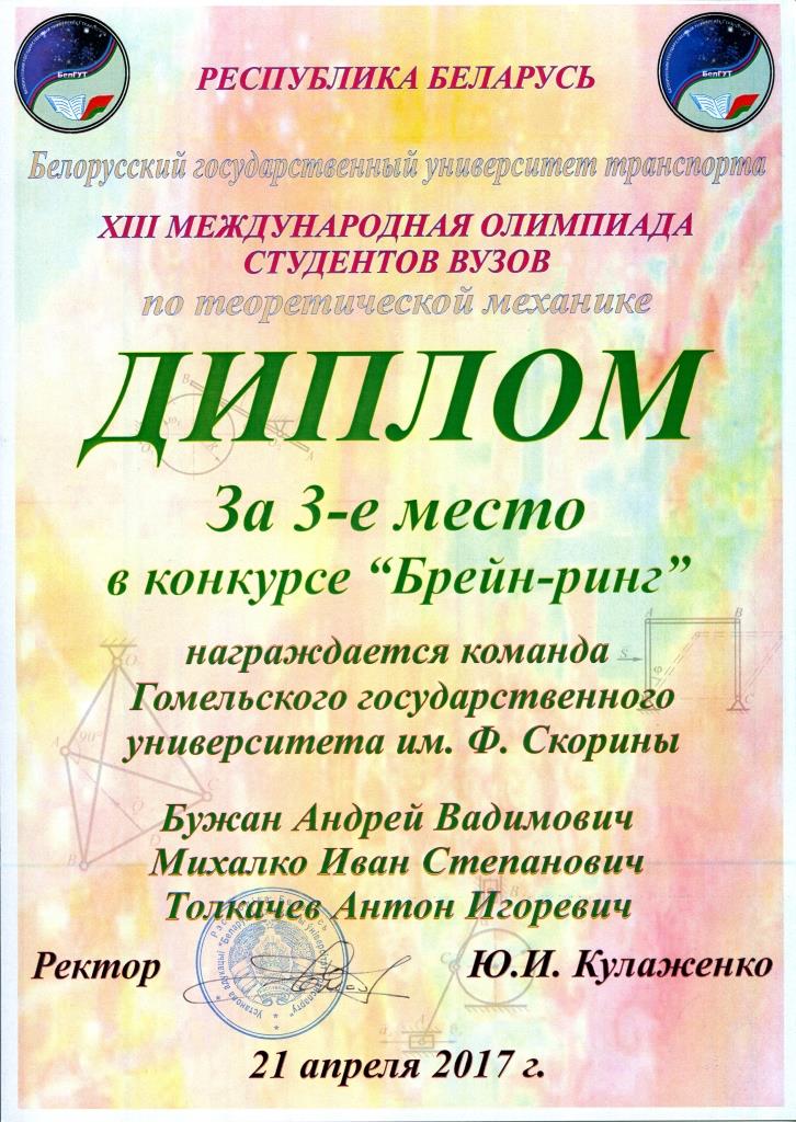 С 18 по 21 апреля 2017 года в Белорусском государственном университете транспорта состоялась XIII международная студенческая олимпиада по теоретической механике. 140 студентов из 5 стран представляли 35 университетов, включая такие известные как Московский физико-технический институт (МФТИ), Московский инженерно-физический институт (МИФИ), Московский государственный технический университет (МГТУ), Санкт-Петербургский государственный университет (СПбГУ), Хэхайский университет (Китайская Народная Республика), Белорусский государственный университет (БГУ), Белорусский национальный технический университет (БНТУ), Киевский национальный университет им. Шевченко, Харьковский национальный университет им. Каразина, Туркменский государственный университет им. Махтумкули. ГГУ им. Ф. Скорины представляли четыре студента факультета физики и информационных технологий. В состав жюри входили представители университета-организатора и руководители команд-участников. В первый день работы состоялся индивидуальный теоретический тур, в котором участникам было предложено за 4 часа решить 8 сложных задач по теоретической механике: две по статике, две по кинематике и четыре по динамике. Полное решение каждой из задач оценивалось в 10 баллов. После четырёх часов напряжённой работы участников и последующей не менее напряжённой работы жюри, после проведения (во второй день) всех апелляций, выяснилось, что золотыми медалистами олимпиады стали три студента из МФТИ и по одному студенту из Хэхайского университета и Туркменского государственного университета, набравшие по итогам решения восьми задач более 54 баллов. Надо отметить, что наши студенты-медалисты – второкурсники, а соревноваться им пришлось со студентами всех курсов и магистрантами из университетов, которые славятся подготовкой именно в технической физике. В рамках международной олимпиады отдельно подводились итоги Белорусской республиканской олимпиады по теоретической механике, в которой соревновались команды из 12 университетов нашей страны. В республиканском соревновании Антон Толкачёв одержал уверенную абсолютную победу, и награждён дипломом первой степени. Андрей Бужан среди участников из Беларуси показал второй результат – ему вручён диплом второй степени. Ещё один участник команды – студент первого курса (группа Ф-14пр) Андрей Павленко диплома в личном зачёте не получил, но внёс заметный вклад в уверенную победу команды ГГУ им. Ф. Скорины в командном зачёте. Итоги командного соревнования подводились по сумме трёх лучших результатов участников, представлявших каждую из команд. Наша тройка лучших набрала баллов в полтора раза больше, чем команды, занявшие второе и третье места. Наградой команде ГГУ им. Ф. Скорины в республиканском соревновании стал диплом за I место в теоретическом конкурсе. Такие стабильные результаты двухдневной напряжённой работы свидетельствуют и об отличной подготовке по физике в школе, за которую наши лучшие студенты благодарны своим учителям: Елене Павловне Знахаренко (гимназия № 14 г. Гомеля), Людмиле Ивановне Горбачёвой (Гомельский городской лицей № 1), Татьяне Александровне Прищеповой (СШ № 9 г. Гомеля), и о важности и пользе той работы по подготовке школьников к Республиканским олимпиадам по физике, которую проводили и проводят преподаватели фа