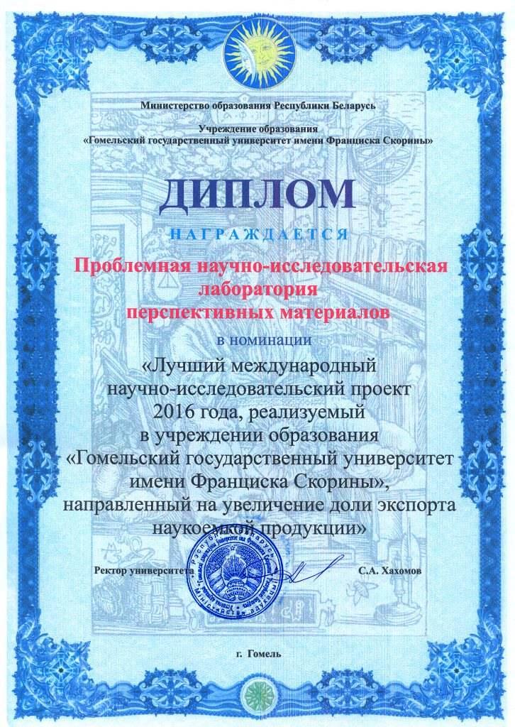 Коллектив физического факультета поздравляет сотрудников ПНИЛ ПМ, ставших победителями в номинации "Лучший международный научно-исследовательский проект 2016 года, реализуемый в УО "Гомельский государственный университет имени Ф. Скорины", направленный на увеличение доли экспорта наукоемкой продукции".