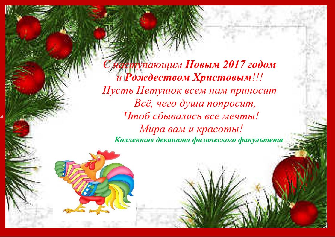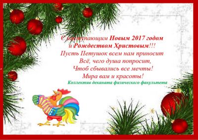 28 декабря 2016 года на физическом факультете состоялось собрание иностранных студентов. Собрание проводили декан физического факультета Д.Л. Коваленко, зам. декана по воспитательной работе Т.П. Желонкина и зам. декана по работе с иностранными студентами С.А. Лукашевич. В процессе собрания иностранных студентов поздравили с наступающим Новым Годом и разъяснили правила поведения в общежитии и общественных местах на грядущие праздники. Напомнили о запрете распития спиртных напитков и употребления курительных смесей.