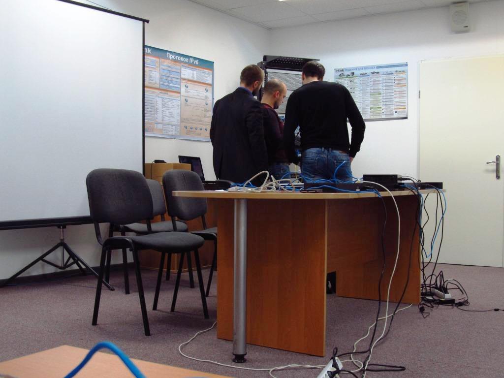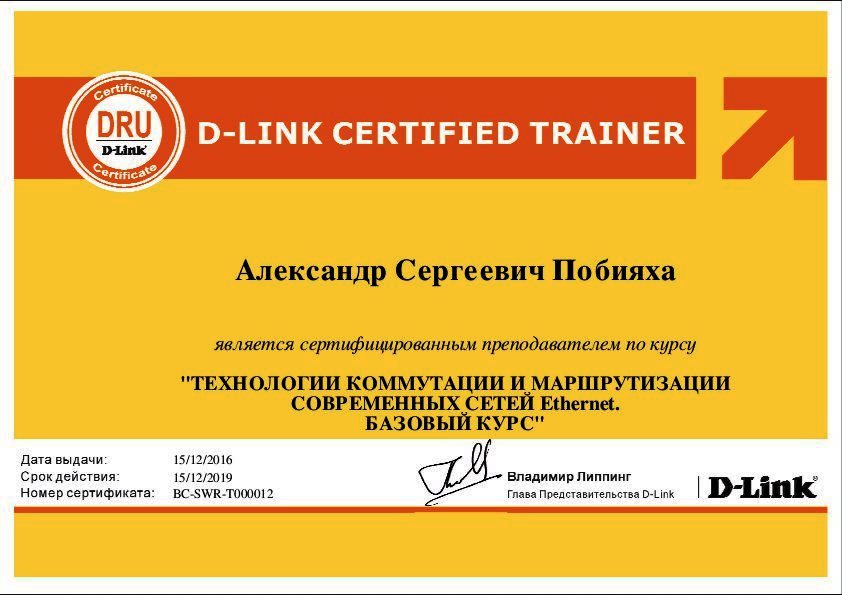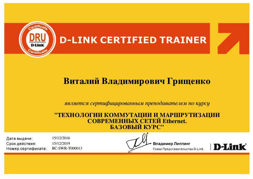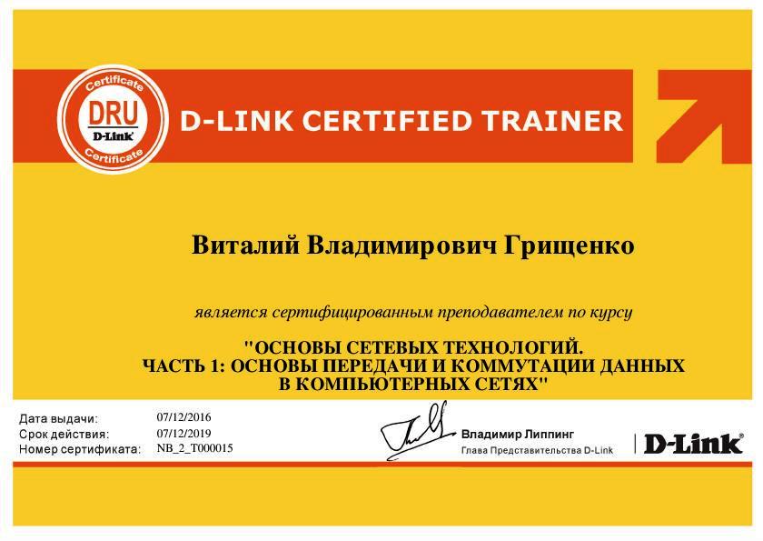 С 05.12.2016 по 16.12.2016 старшие преподаватели кафедры общей физики Грищенко В.В., Побияха А.С. и Соколов С.И. проходили стажировку в учебном центре Представительства компании D-Link в Республике Беларусь, по результатам которой были успешно сданы сертификационные экзамены для получения статуса инструктора по курсам "Основы передачи и коммутации данных в компьютерных сетях" и "Технологии коммутации и маршрутизации современных сетей Ethernet", а совместно организованная лаборатория получила статус Официального авторизованного учебного центра, пока единственного на территории Республики Беларусь. Сертификация по учебным курсам компании D-Link предполагает успешную сдачу экзамена по теоретической составляющей курса, а также выполнение практической работы с использованием современного оборудования и передовых сетевых технологий передачи данных.