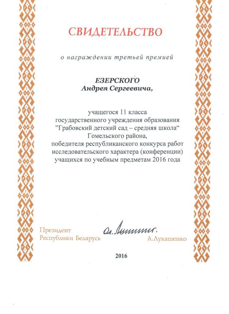 2 декабря состоялось награждение специальным фондом поддержки талантливой молодежи, на котором был отмечен студент первого курса физического факультета Езерский Андрей, занявший 3 место в Республиканском конкурсе работ исследовательского характера (конференции) учащихся по учебным предметам 2016 года. Награжден премией третьей степени.