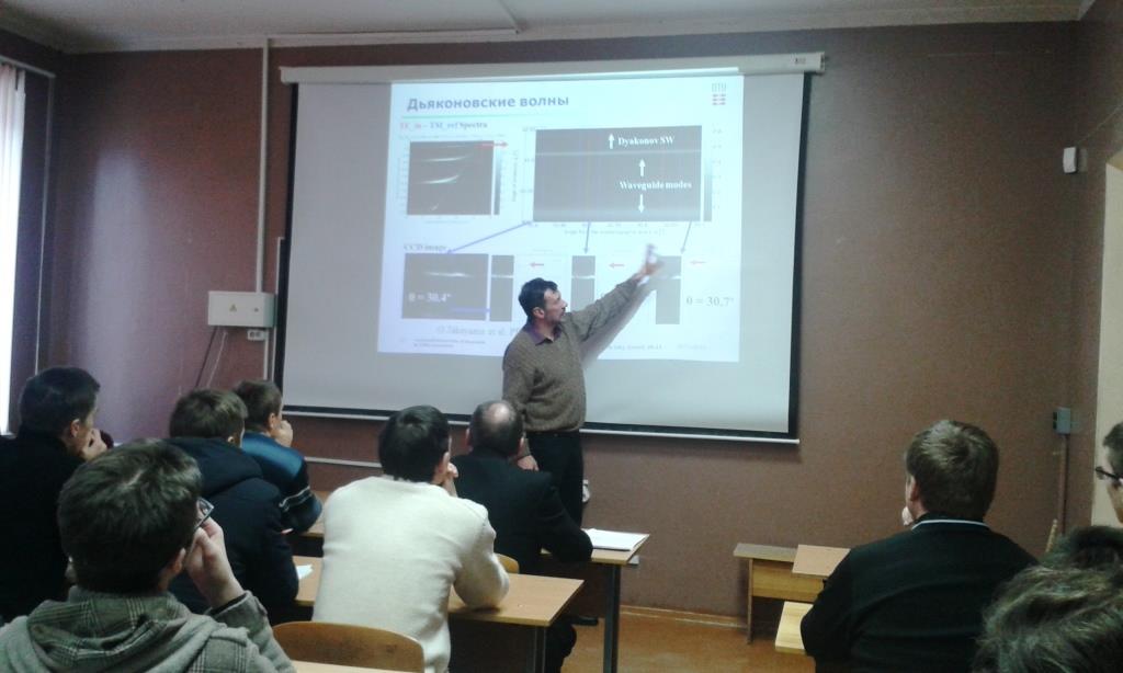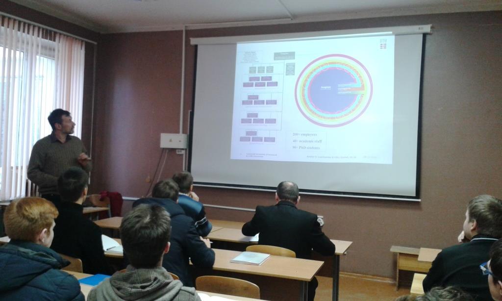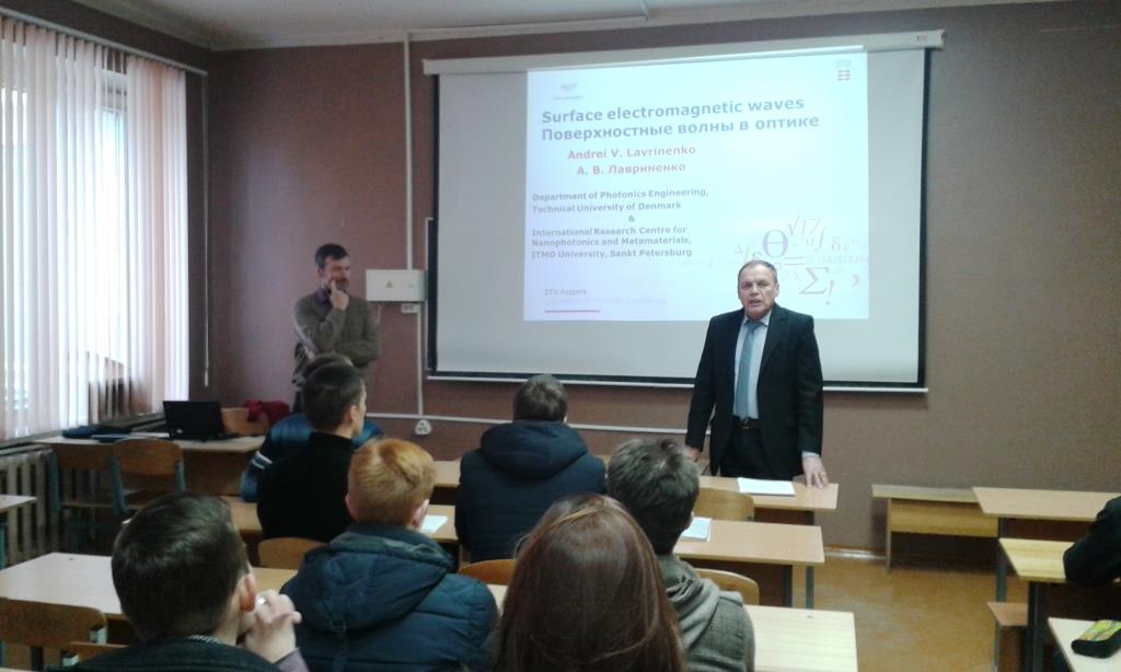 C 28.11.2016 по 29.11.2016 года ГГУ имени Ф. Скорины посетил известный ученый в области фотоники - Андрей Владимирович Лавриненко, доктор физико-математических наук, доцент факультета фотонной инженерии Датского технического университета (г. Люнгбю, Дания). Андрей Владимирович посетил ректорат ГГУ, где обсудил вопросы научного сотрудничества, обмена магистрантами и аспирантами между ГГУ и Датским техническим университетом. Андрей Владимирович прочитал студентам физического факультета лекции: - Лекция 1. Поверхностные волны в оптике. - Лекция 2. Поверхностные волны на метаматериалах. - Лекция 3. Линейные и нелинейные свойства тонких плазмонных волноводов. - Лекция 4. Метаповерхности в ТГц и ГГц диапазонах.
