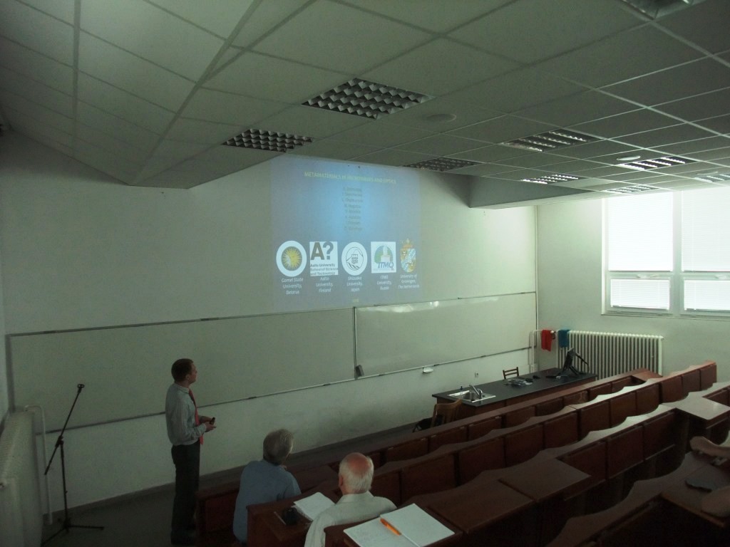 На материаловедческом факультете Словацкого технического университета в Братиславе состоялись две презентации доцента кафедры оптики ГГУ им. Ф. Скорины, к.ф.-м. н. Балмакова А.П. на следующие темы: I. «Francisk Skorina Gome lState University», II. «Metamaterials in microwaves and optics». Словацкие коллеги, присутствующий на презентациях, с интересом слушали доклады, и остались довольны тем, что им удалось поближе узнать о достижениях коллег из ГГУ, а также познакомиться с новой для них областью физики под названием метаматериалы. В настоящее время Алексей проходит стажировку в указанном университете, где совместно с коллегами из ГГУ – Д. Пилипцовым, А. Руденковым, а также при поддержке профессора А. Чауса, работает над исследованием свойств тонких углеродных пленок легированных титаном. Параллельно с этим, Алексей, совместно с коллегами из ГГУ - И.В. Семченко, С.А Хахомовым и Университета Аалто (Финляндия) – С.А. Третьяковым, также занимается моделированием нового класса материалов, так называемых метаматериалов, обладающих уникальными оптическими и электродинамическими свойствами.