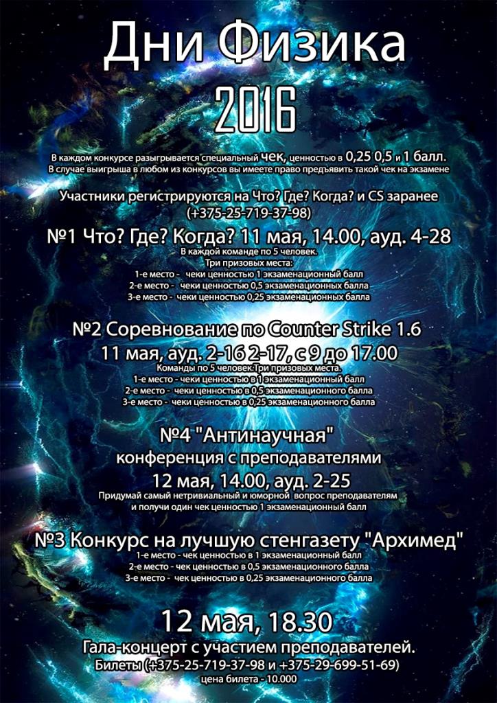 C 11 по 12 мая 2016 года на физическом факультете прошли "Дни физика". 11 мая в соревновании по Counter Strike приняли участи две команды – команда студентов группы АС-26 (Беляков Максим, Андрианов Иван, Степовиков Александр, Скоряк Артем, Новак Артем) и сборная команда студентов физический специальностей (Бондарь Константин Ф-24пр, Слепенков Дмитрий Ф-23пед, Нельп Иван Ф-25у, Дзюба Владислав Ф-23пед, Быльков Леонид ФТТ-42). Победу в игре одержала команда группы АС-26.