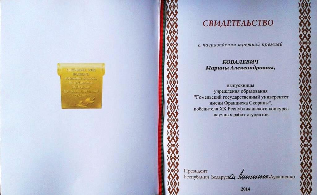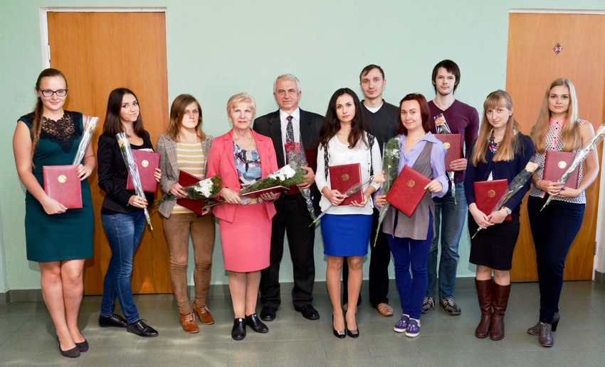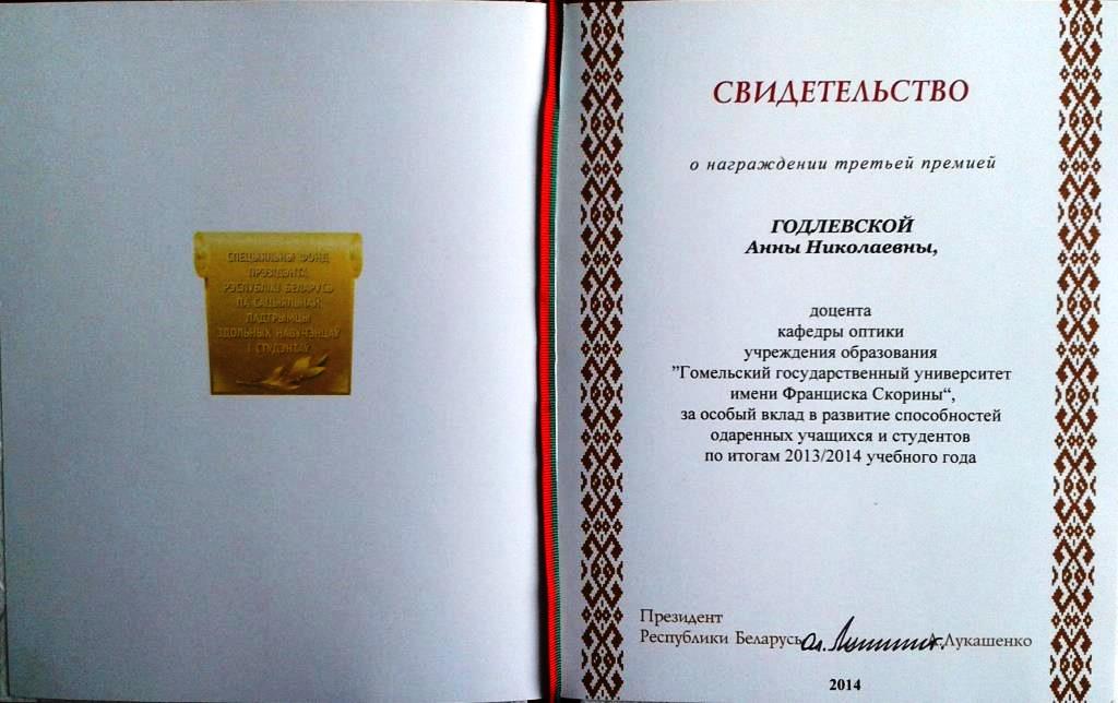Деканат физического факультета, преподаватели и студенты поздравляют доцента кафедры оптики Годлевскую А.Н. с получением третьей премии специального фонда Президента Республики Беларусь по поддержке одаренных учащихся и студентов, за особый вклад в развитие способностей одаренных учащихся и студентов. Так же третьей премией специального фонда Президента Республики Беларусь награждены выпускницы физического факультета Ковалевич Марина Александровна и Ленченкова Ирина Юрьевна за победу на республиканском конкурсе научных работ студентов.