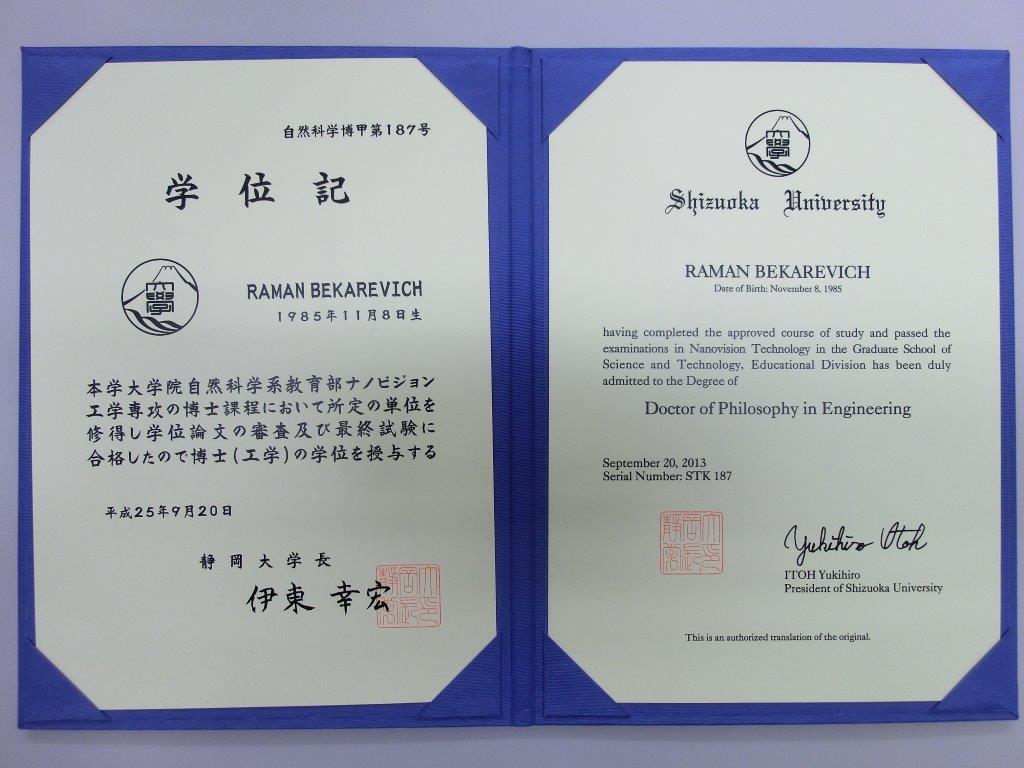 20 сентября 2013 года выпускникам аспирантуры УО «Гомельский государственный университет имени Франциска Скорины», проходившим стажировку и обучение в университете Шизуока (Япония) в рамках международной программы «Интеракадемия» Бекаревичу Роману и Балмакову Алексею были торжественно вручены дипломы доктора философии в области физики (Doctor of Philosophy).