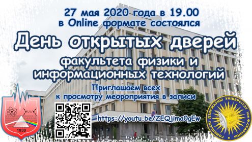 23 апреля 2020 года был проведен факультетский этап XLIХ студенческой научной конференции «Дни студенческой науки». Традиционно факультетский этап конференции был совмещен с ежегодной Республиканской научной конференцией студентов, магистрантов и аспирантов «Актуальные вопросы физики и техники», которая проводится на базе факультета уже девятый раз. В этом году, в связи со сложившейся эпидемиологической ситуацией, конференции было решено провести заочно. 23 апреля 2020 года на Youtube-канале факультета физики и информационных технологий было проведено онлайн Пленарное заседание IX Республиканской научной конференцией студентов, магистрантов и аспирантов «Актуальные вопросы физики и техники». В 11-00 в аудитории 211 корпуса 5 декан факультета Коваленко Дмитрий Леонидович и проректор университета по учебной работе Семченко Игорь Валентинович поприветствовали всех участников и дали старт конференции. Далее заместитель декана по учебной работе факультета физики и информационных технологий Самофалов Андрей Леонидович рассказал о возможностях участия в международных программах и проектах, которые сегодня доступны для студентов, магистрантов и аспирантов факультета и изложил Перспективы участия факультета физики и ИТ в программе ERASMUS+ (акроним CybPhys).