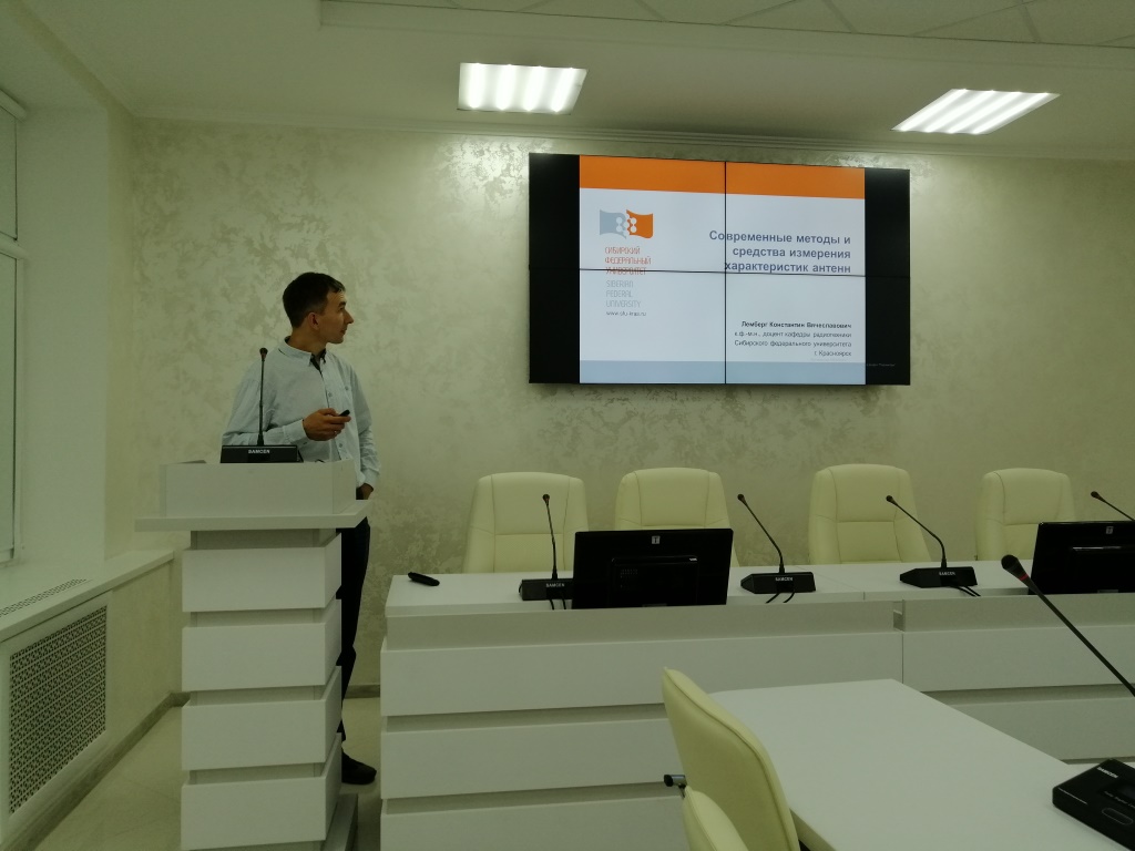 26 сентября 2019 года к.ф.-м.н., доцент кафедры радиотехники Института инженерной физики и радиоэлектроники Сибирского федерального университета (г. Красноярск) К.В. Лемберг прочитал лекцию для студентов факультета физики и ИТ на тему «Современные методы и средства измерения характеристик антенн». На лекцию были приглашены магистранты, аспиранты и преподаватели факультета. К.В. Лемберг также рассказал о научных исследованиях, проводимых в его институте.