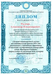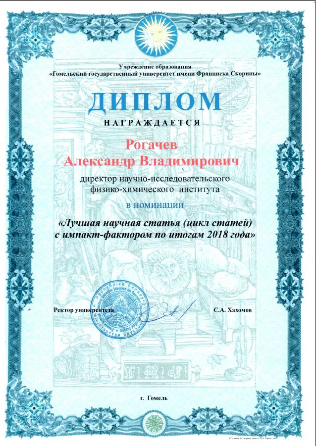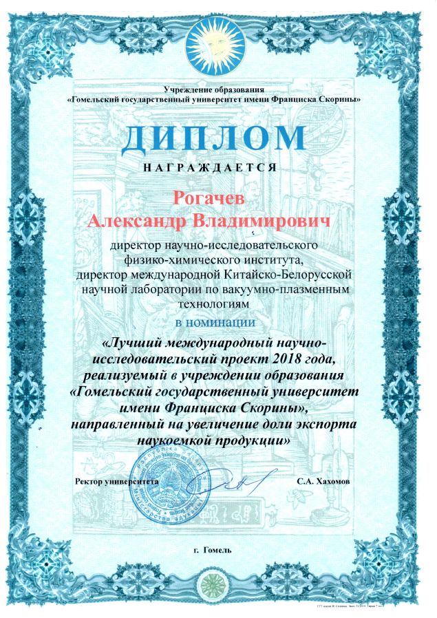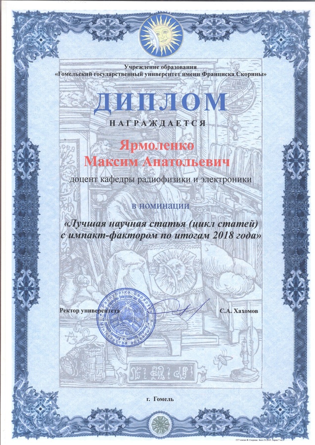 25 января, накануне Дня белорусской науки, Президент Беларуси Александр Лукашенко вручил научным и научно-педагогическим работникам дипломы доктора наук и аттестаты профессора. Среди награждённых – ректор Гомельского государственного университета имени Франциска Скорины, доктор физико-математических наук, доцент Сергей Хахомов. В марте 2018 года высшей аттестационной комиссией Республики Беларусь Сергею Анатольевичу была присуждена ученая степень доктора физико-математических наук по специальности 01.04.05 – оптика. Тема диссертации – «Волновые процессы в метаматериалах и спирально-структурированных системах».
