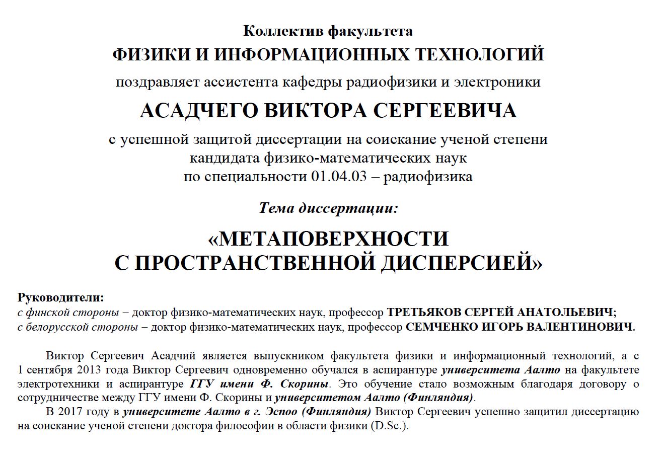 Защита диссертации «Взаимодействие акустических волн в сегнетоэлектриках с электроиндуцированной контролируемой доменной структурой» (Acoustic wave interaction in ferroelectrics with an electroinduced controllable domain structure) состоялась 17 июля 2018 года в рамках программы получения двойной степени кандидата наук, действующей между ГГУ имени Ф. Скорины и университетом Шизуока. Руководитель работы с белорусской стороны – Хахомов С.А., с японской стороны – Кондох Д. (Jun Kondoh).