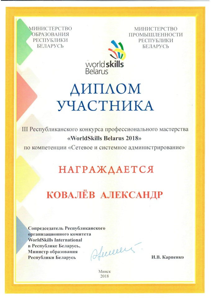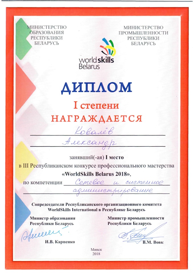 Деканат факультета физики и информационных технологий поздравляет Ковалёва Александра Юрьевича, студента факультета физики и информационных технологий, группы МС-32 специальности «Программируемые мобильные системы» победителя в номинации «Сетевое и системное администрирование» III Республиканского конкурса профессионального мастерства среди рабочих (служащих), специалистов и обучающихся, получающих профессионально-техническое, среднее специальное, высшее образование «WorldSkills Belarus 2018», который проходил 20-24 мая 2018 года (г. Минск).
