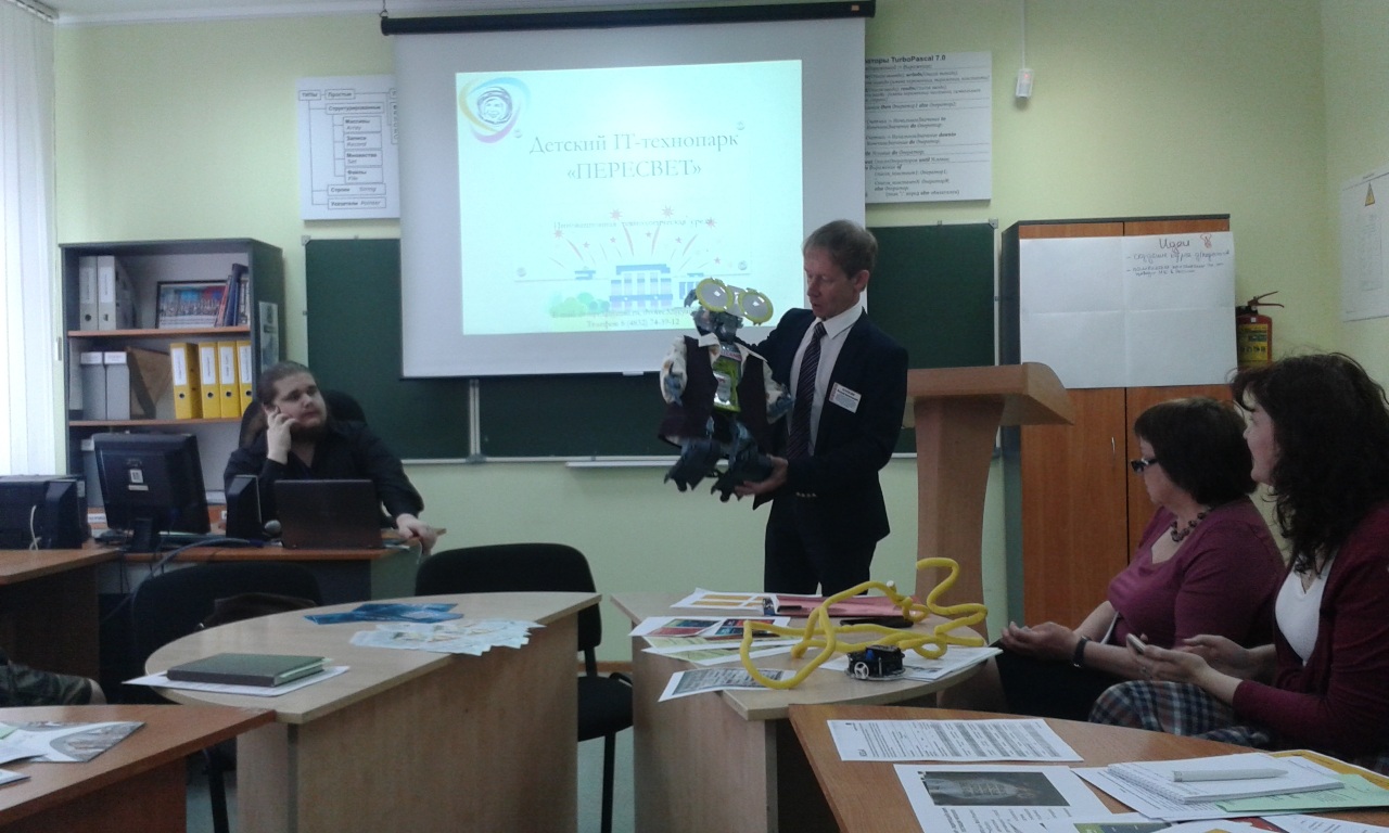 Особенно запоминающимся было выступления учителя английского языка ГУО СШ №37 Виталия Валентиновича Петровского который поделился опытом использования на своих уроках робота Мекканоида, который не только прекрасно говорит на английском языке, но и замечательно танцует и очень эрудирован.