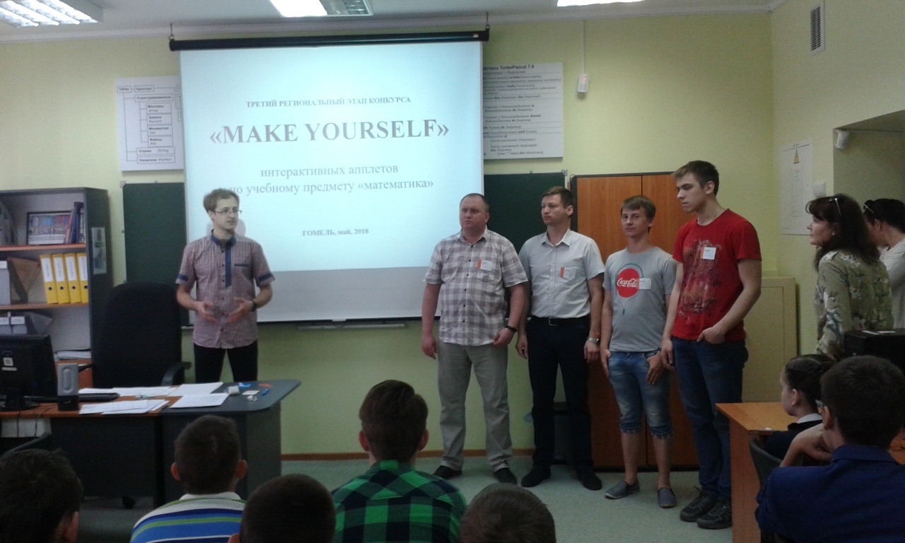 10 мая 2018 года в стенах областного Дворца творчества прошел третий региональный этап конкурса интерактивных апплетов по учебному предмету «Математика» «MAKE YOURSELF». Инициатива проведения этого конкурса принадлежит учреждениям образования города Минска. Учащиеся 5-6 классов из учреждений образования города Гомеля и Гомельской области представили на суд жюри проекты написанные в популярной среде программирования Scratch в следующих номинациях: «Maths smarts» – апплеты для тренировки навыков по отдельным темам учебной программы по предмету «Математика»; «Smart learning» – проекты (игры), способствующие изучению отдельных разделов учебного предмета «Математика»; «Play logic» – логические математические игры. В качестве членов жюри конкурса были приглашены заместитель декана факультета физики и информационных технологий ГГУ имени Ф. Скорины Самофалов А.Л. и студенты 3 курса специальности «Программируемые мобильные системы» Кравченко В.А. и Карабань А.В.