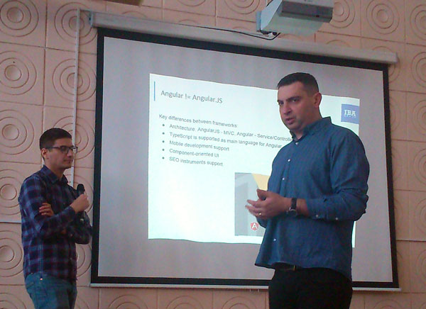 В рамках развернутого доклада начальник отдела Решений по Информации и Инфраструктуре Ицхаки Лави и ведущий разработчик ООО «ИВА-Гомель-Парк» Павел Мигаев разъяснили студентам порядок и детализацию процессов современной разработки веб-приложений. В частности, в рамках выступления, был раскрыт механизм взаимоотношений Front-end (клиентская сторона пользовательского интерфейса к программно-аппаратной части сервиса) и Back-end (программно-аппаратная часть сервиса). В части практических рекомендаций докладчики провели обзор самых популярных технологий и инструментов разработки веб-приложений. Для back-end: Node.js, Express, Loopback framework, Sails framework, для front-end: Angular 2+, Angular-material; БД: MongoDB.