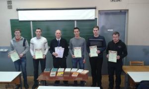 Начало марта в этом году оказались временем проведения в трёх университетах города сразу трёх студенческих олимпиад, в которых студенты факультета физики и информационных технологий приняли активное участие. Предварительно, как отборочное соревнование состоялась факультетская олимпиада по математике для первокурсников, которую убедительно выиграл студент группы КФ-17 Евгений Головин, до поступления в вуз дважды оказывавшийся в числе победителей Республиканской олимпиады школьников по физике. Кроме него награждены дипломами были: Е. Руденков (группа АС-16), Т. Волосянкин (АС-16), К. Якубов (Ф-14пр) и В. Сетун (АС-16).