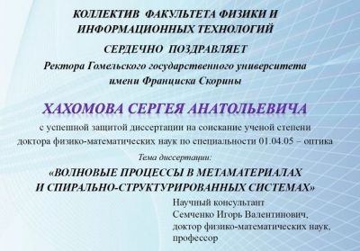 14 ноября 2017 состоялись выборы академиков и членов-корреспондентов Национальной академии наук Республики Беларусь. Приятно осознавать, что среди новых членов-корреспондентов наш выпускник – Николай Владимирович Тарасенко, с отличием окончивший в 1975 году физический факультет Гомельского государственного университета, затем – аспирантуру Института физики НАН Беларуси. Н.В. Тарасенко успешно защитил кандидатскую (1999) и докторскую (2012) диссертации в отрасли физико-математических наук, ему присвоено ученое звание доцент по специальности «Физика» (2000). С 2015 Н.В. Тарасенко – заведующий центром «Физика плазмы» Института физики НАН Беларуси.