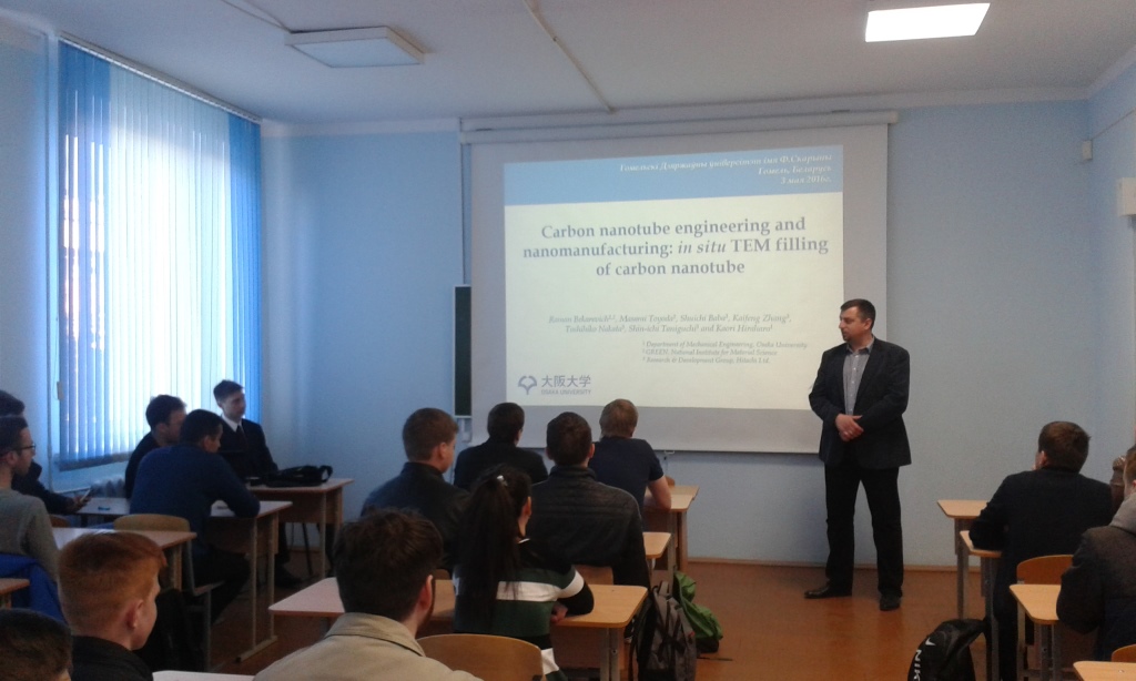 C 3 по 4 мая 2017 года для студентов факультета физики и информационных технологий прочитал курс лекций доктор PhD, научный сотрудник Национального института материаловедения (Цукуба, Япония) - Роман Бекаревич. Тема лекции: Carbon nanotube engineering and nanomanufacturing: in situ TEM filling of carbon nanotube. Роман Бекаревич окончил с отличием в 2007 году физический факультет. С 2007 по 2010 – обучался в аспирантуре ГГУ. С 2010 по 2013 обучался в аспирантуре Университета Сузока, где ему была присуждена ученая степень доктора PhD. C 2013 Роман работает в различных научных институтах Японии. Помимо научного доклада Роман Бекаревич рассказал о Японии и об институте в котором он сейчас работает.
